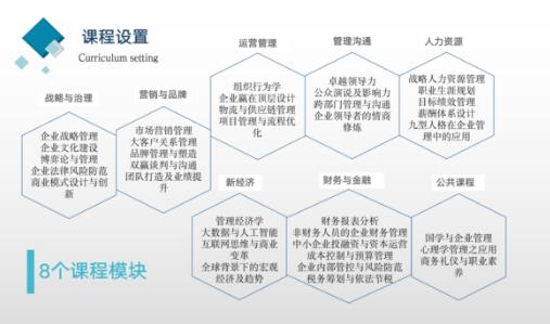 企业战略管理、人力资源管理、运营管理、企业财务管理、项目管理、组织行为学、市场营销管理、管理经济学、企业文化与核心竞争力、电子商务的商业模式、卓越领导力、企业法律实务。