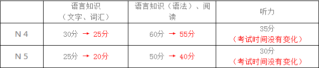 N4及N5的“语言知识(文字、词汇)”及“语言知识(语法)、阅读”的考试时间发生变化。下图中的红色文字是变更后的新的考试时间。