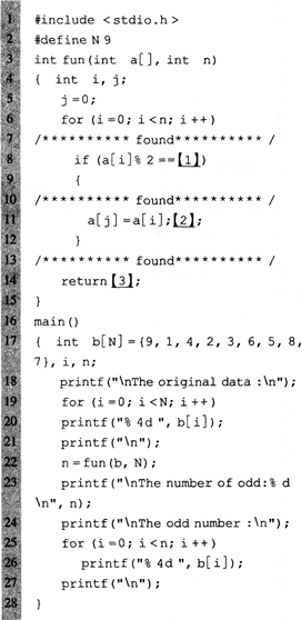1、下列给定程序中,函数fun的功能是:把形参a所指数组中的奇数按原顺序依次存放到a[0]、a[1]、a[2]…中,把偶数从数组中删除,奇数个数通过函数值返回。