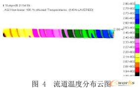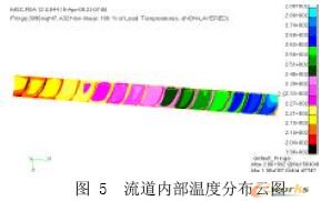 图4~图6 分别为沿挤出方向、整段流道的温度分布云图、流道内部的温度分布云图以及沿轴向方向的温度与位移曲线. 从温度云图可知,温度沿挤出方向逐渐升高,这与实际生产中的温度分布趋势一致. 图6 的位移-温度曲线进一步证明这一点,且可由该曲线可知温度沿轴向近似成线性分布,这与一些试验理论相符.
