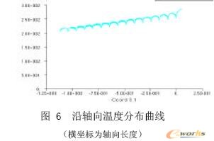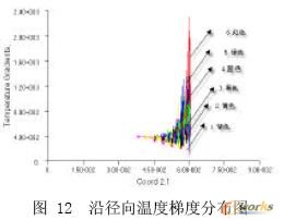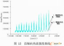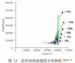 图10到图11是温度梯度分布图. 图10为整段模型的温度梯度分布云图,图11为轴向温度梯度分布曲线,图12为径向温度梯度分布曲线. 从云图和相关曲线可知,整个流道中,熔体较薄处,温度梯度较大,螺棱处熔体的温度梯度明显比螺槽处熔体温度梯度大,并且沿轴向方向温度梯度也增大.图13是沿轴向热流强度分布曲线,而图14是沿径向热流强度分布曲线. 从图可知,热流强度沿挤出方向逐渐增大,而沿径向热流也增大. 这是因为沿轴向外界温度逐渐增大,所以热流强度也增大.