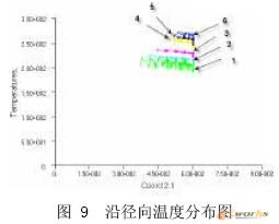 图7为温度沿径向的分布图. 温度沿径向的总趋势是逐渐降低,但是降幅较小,图8为沿轴向不同的位置截取6个截面,分析不同截面的径向温度的分布曲线. 图9 则为对应于6个不同位置的径向温度分布曲线. 由图可以看出:温度随径向的变化不大,靠近螺杆的部分温度稍高一些,靠近料筒处温度稍低.