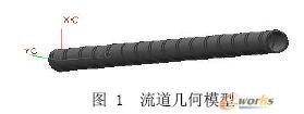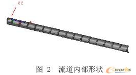 根据实际生产的尺寸,用UG建立起螺杆3维模型,并借助UG中的布尔减运算从机筒中减去螺杆所得的3 维实体即为流道的真实模型.该流道的长度为1250 mm,厚度较大为22 mm,较薄的地方是0.5 mm,该流道几何参数及其内部结构见图1和图2。