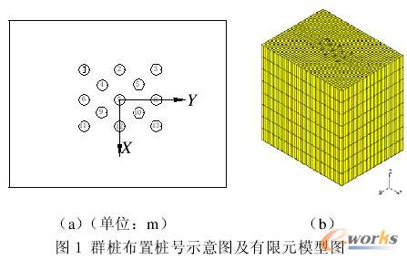 本文将桩体采取线弹性模型,土本构关系取为剑桥模型,群桩布置见图 1a。在选取土体的模型时由于选取的范围较大,因此土体的边界条件可近似认为与周围土体固结,即模型两边假设为竖向辊轴支座,土体底端假设为固端边界条件。模型采用 3D-solid7 单元,其中桩体 260 个单元,地基土体 9646 个单元,考虑桩土之间的接触关系,选用Coulomb触摩擦模型,摩擦系数取为 0.3。模型荷载有:自重、作用在桩体区域的均匀荷载(500KPa)。几何网格划分见图 1b,有限元计算参数[4]见表 1。