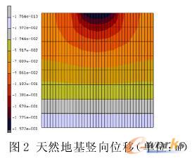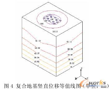为了说明复合地基对天然地基的沉降与承载能力的改善程度,对天然地基与复合地基分别进行了模拟分析。从图 2可看出,没有加固的天然地基土体压缩变形明显,较大沉降为197mm;从图 5、图 6 可知经过微桩加固后的复合地基竖向位移明显小于天然地基,较大沉降为 150.2mm,可见微桩对地基沉降的减小效果十分显著, 约为 25%。