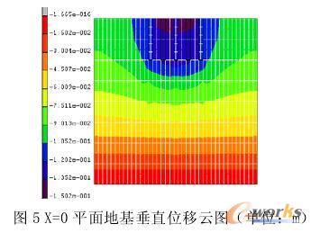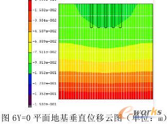 从图 3 与图 4 中可知微群桩复合地基的位移在垂直方向上减小过程比较均匀,同一高度地基位移大致相等;在水平方向上,以 7 号桩为原点,复合地基的位移从里向外形成三个接近圆形的沉降区域,沉降在水平面上总体变化比较均匀,其中桩体所在的区域是复合地基沉降较大部分,达到 150mm。图 5 反映了复合地基在 X=0 平面沉降分布,说明在 Y 方向上,荷载范围内地基沉降较大,影响长度约为群桩的分布长度,较大沉降影响深度大约为桩体深度,靠近桩体的土体在同一高程上垂直位移相差比较大;随着深度的加深,同一高程的地基垂直位移大致相等。图 6 反映了复合地基在 Y=0 平面沉降分布,在 X 方向上,较大沉降仍出现在荷载作用的范围内,影响宽度略大于群桩分布宽度,影响深度略小于桩体长度,在其它范围内同一高程的土体垂直位移大致相同。另外,图 5 和图 6 显示加固区的桩体和土体的位移是一致的,都为 133 mm~150mm,说明了加固区的地基是共同作用协条变形的。通过以上分析可知,在微群桩所在的区域形成了圆形的较大沉降区,影响深度约为桩长,并且这个区域的附近的地基土体在 X 和 Y 方向的垂直位移相差比较大,可能形成不均匀沉降,因此在施工设计中应该采取一定的措施减小桩体所在区域的沉降,也需要采取措施改善桩体深度范围内的地基土体的不均匀沉降。总体来说,微群桩复合地基呈整体下沉趋势,整体上沉降比较均匀;同时桩体与地共同作用协调变形,有利于改善地基的变形特性。