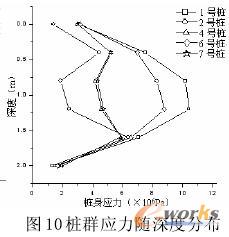图 8 反映了桩应力沿深度变化,其中 1 号与 6 号桩的应力沿深度的先变大,到达桩长3/5 处应力达到较大,值为 10×106Pa,然后又减小;2 号、4 号、7 号桩的变化规律是一致的,先增大,随后又变小,又增大,达到较大,在桩深的 3/4 处,约为 5.0×106 Pa,较后又减小,其中 4 号、7 号桩的应力分布几乎一样。另外,1 号与 6 号桩的应力通长大于其它桩,群桩的 3/4 处往下的应力大小和分布几乎是一样的。通过分析可知,微群桩位置 1 号与 6 号的边桩应力比较大,较大值发生在约为桩长的 3/5 处,可以考虑在施工中采用强度比较高的混凝土来制作这些位置的桩体;桩端的应力比较小,而桩的中间部位附近的应力比较大,在设计中有必要重点考虑这些部位。另外,边桩的应力大于中间桩的应力。图 9 反映了桩身摩阻力分布,群桩的摩阻力分布形式几乎是一致的,但是摩阻力的值却很小,数量级为 10-12Pa,这说明了微群桩复合地基上部荷载不是通过摩阻力传递的,而是基本是通过桩身传递,微桩是承受上部荷载的主体。