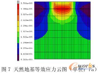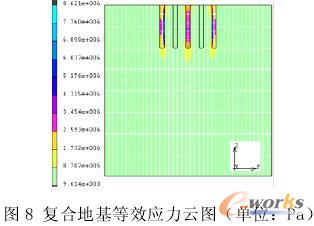 图 7 说明天然地基土的应力分布均匀,荷载由整个地基承担,但是地基应力仅为 3.76×105 Pa;从图 8 中可知微群桩复合地基中较大应力为 8.621×106Pa,可见微桩加固的复合地基极大的提高了地基的承载能力,效果非常显著。另外,桩体承担的应力约为 1.732×106~8.621×106Pa,桩端附近的土体承担的应力约为 1.732×106 Pa,其余地基承担的应力只有9.614×103 Pa~8.707×105 Pa,可见 微群桩复合地基中桩体承担了大部分应力,这是因为桩体和地基土体是协调变形的,所以应力按照地基材料弹性模量分配的,而混凝土桩体的弹性模量远远大于软土地基的弹性模量,所以地基应力主要集中于桩体上,使桩体承担大部分荷载,土体承担小部分荷载,这有利于充分发挥混凝土的力学性能。另外,可知微群桩复合地基的受力层在桩体加固区,所以微群桩复合地基是不同于群桩基础的,因此在设计中需要区别对待。