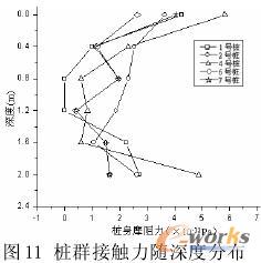 (6)群桩的摩阻力分布形式几乎是一致的,但是摩阻力的值却很小;这说明了微群桩复合地基上部荷载基本是通过桩身传递,微桩是承受上部荷载的主体。