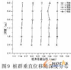 (4)对于梅花形布置的微桩群来说,7 号桩位置的桩的垂直位移比较大;复合地基垂直位移沿桩长变化不大,这与桩基的桩体位移变化规律不一样。